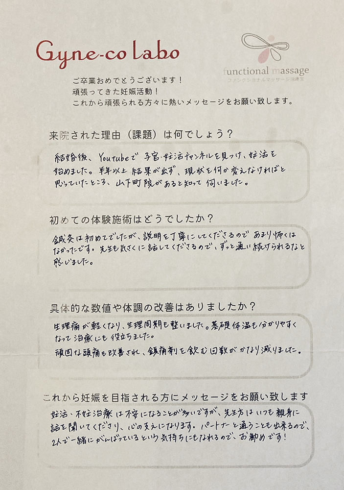 生理痛が軽くなり、生理周期も整いました。基礎体温も分かりやすくなって治療にも役立ちました。