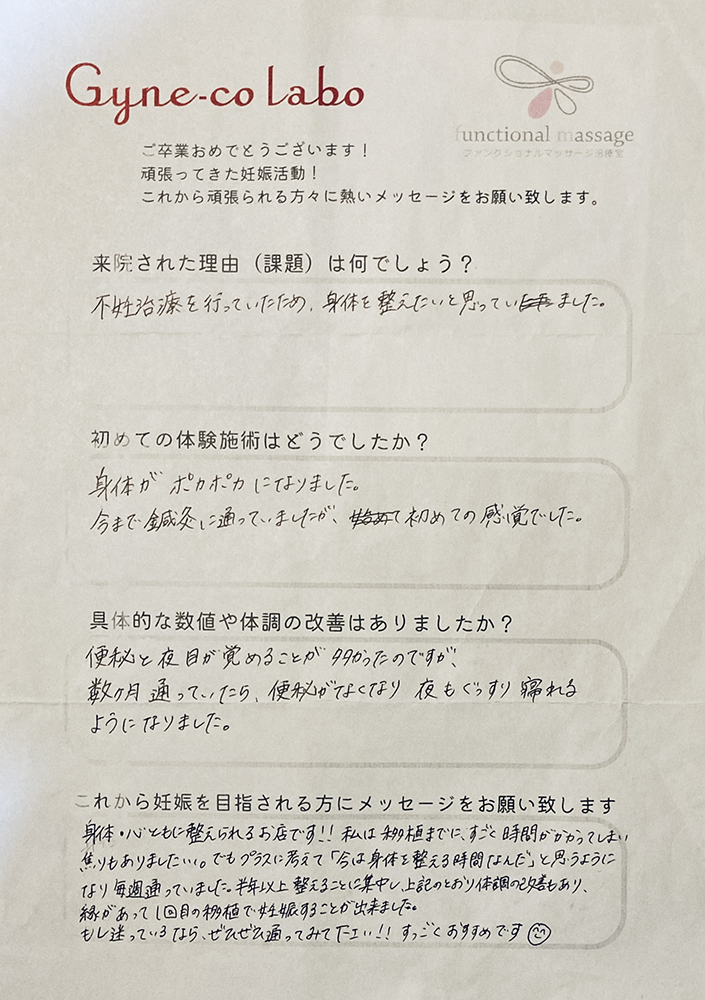 身体・心ともに整えられるお店です!!私は移植までにすごく時間がかかってしまい焦りもありました…。でもプラスに考えて「今は身体を整える時間なんだ」と思うようになり毎週通っていました。半年以上整えることに集中し、上記のとおり体調の改善もあり、縁があって1回目の移植で妊娠することが出来ました。