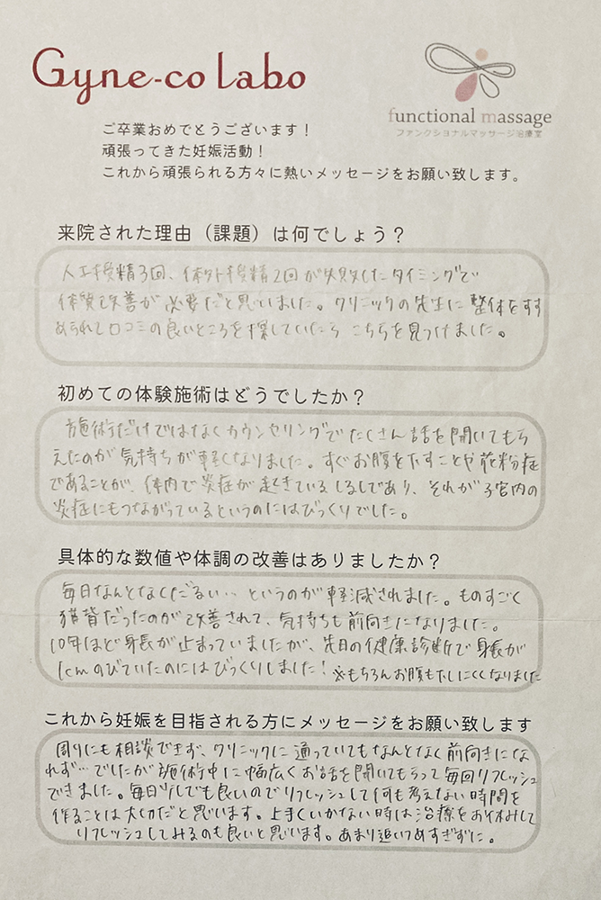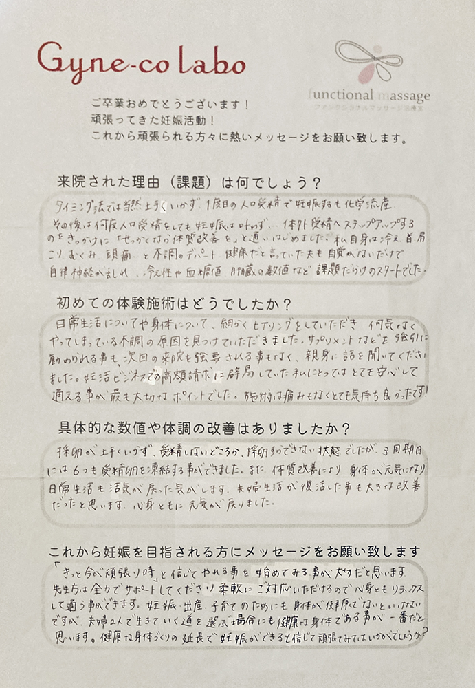 妊活はゴールが見えずとても不安な治療ですが、私はジネコラボに通ったことで体調や数値の改善が見られました。しかし、それだけではなく毎回の施術で先生と話す時間が楽しくて通っていました。あまり深く考え過ぎずにリラックスした気持ちで諦めずに妊活を続けて下さい。