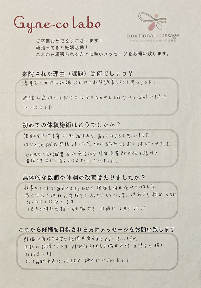 また、色々と何でも相談でき、前向きに妊活に取り組めた事が良かったです。